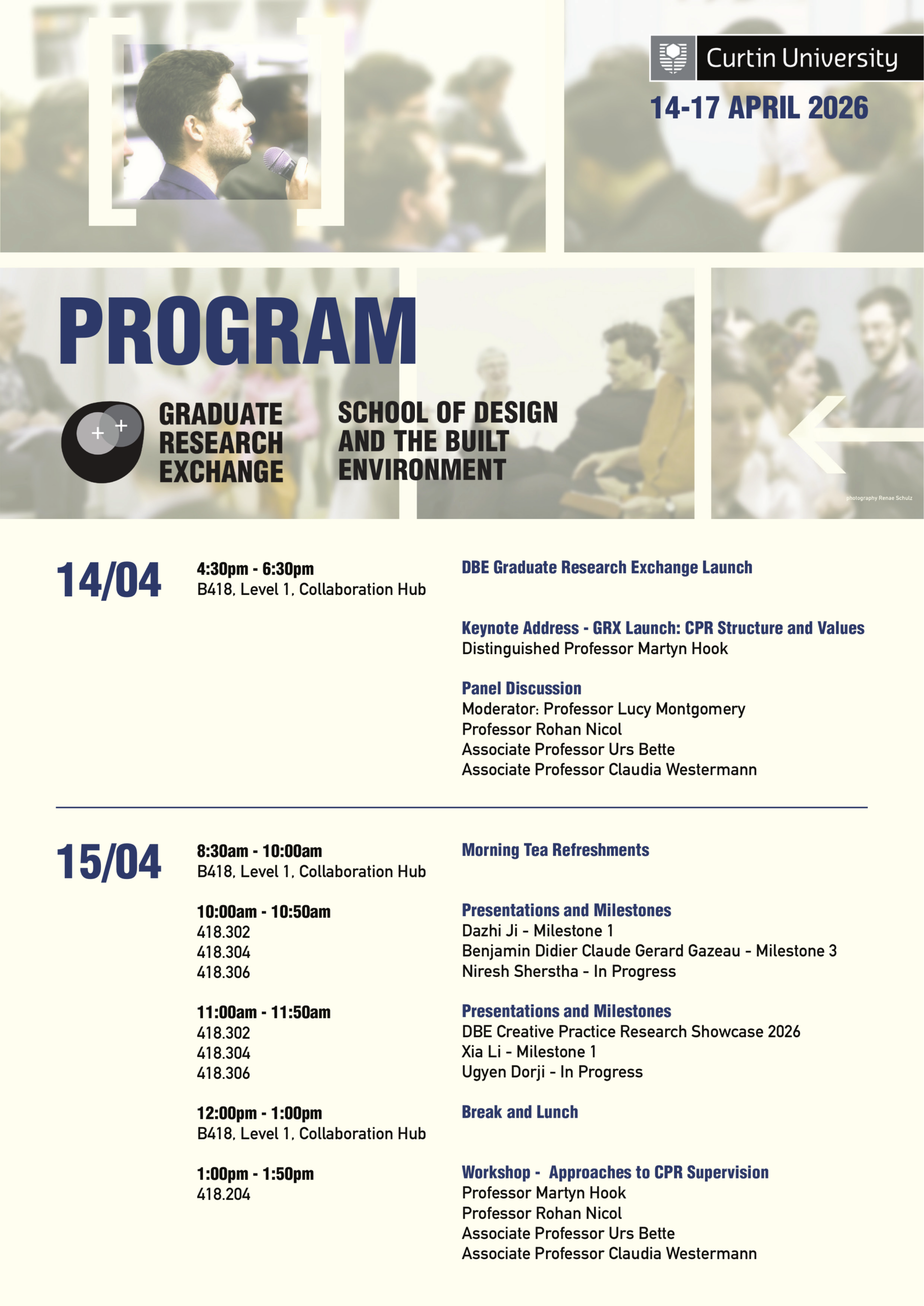 GRX – Graduate Research Exchange /events/graduate-research-exchange/ /events/graduate-research-exchange/#respond Thu, 02 Apr 2026 06:35:45 +0000 /events/?p=7622 The DBE Graduate Research Exchange is a bi-annual forum that brings together traditional and practice-based research in a transdisciplinary environment. Each GRX combines keynote lectures, presentations, panels and workshops, with exhibitions and installations linked to candidate milestones and in-progress talks. The event fosters critical dialogue, shared learning and a visible culture of graduate research across the School of Design and Built Environment.