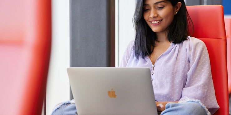 Student sitting indoors looking at a grey laptop.